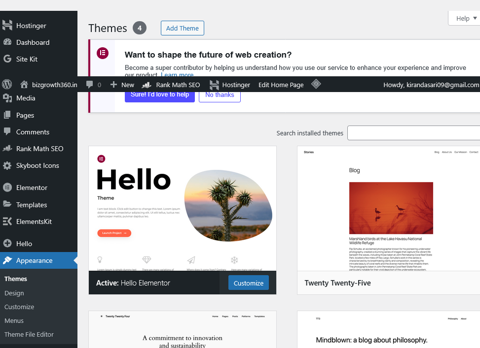 WordPress ni Hostinger lanti hosting lo premium builder tho easy ga setup cheyavachu. “Add Website” option use chesi WordPress create chesukoni, Astra ledha Hello Theme install chesi, Elementor Free use chesi pages design cheyavachu.